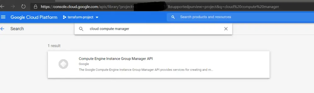In the search bar, type the API required to be enabled. In our case, we are looking for ‘Cloud Compute Manager’,