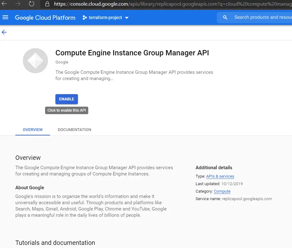 If you are working under another organization, then you also need to enable the following 2 APIs,