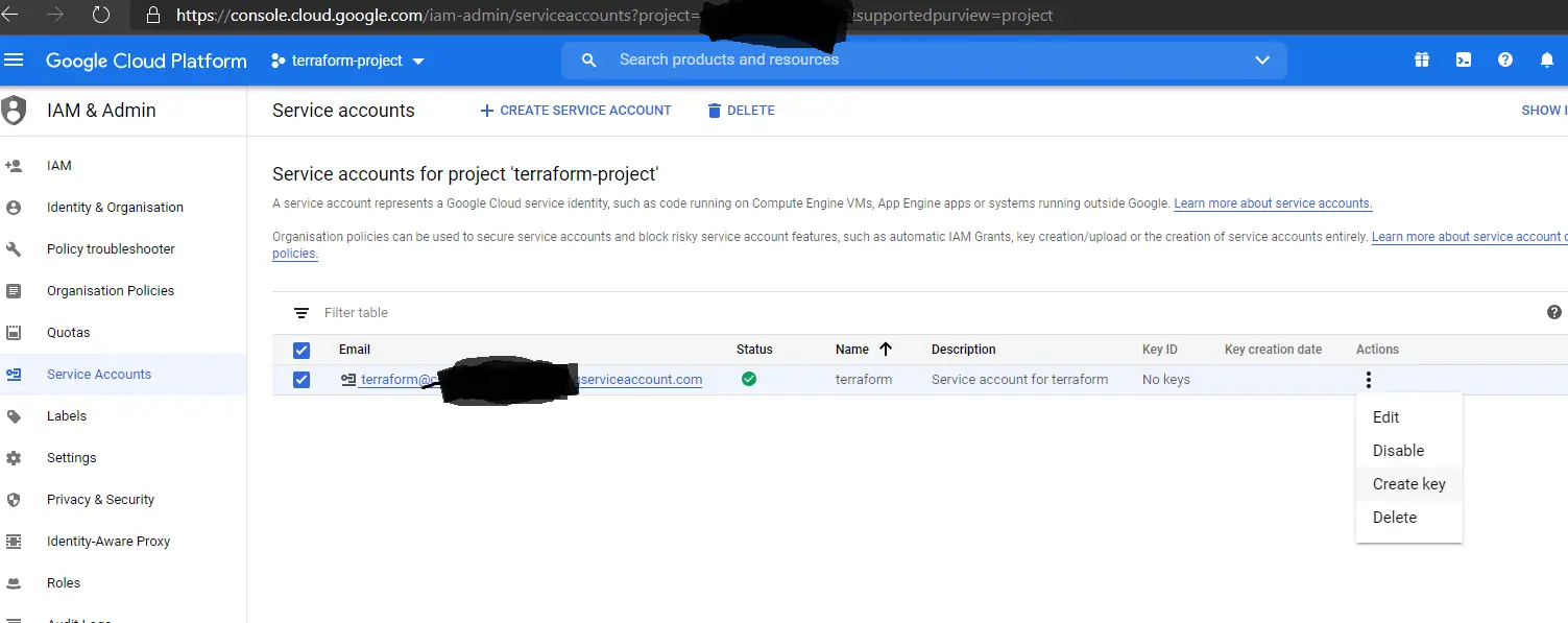 We need to now create a new service account to be used with terraform, so goto ‘IAM & Admin’ section & click on ‘Service Accounts’,